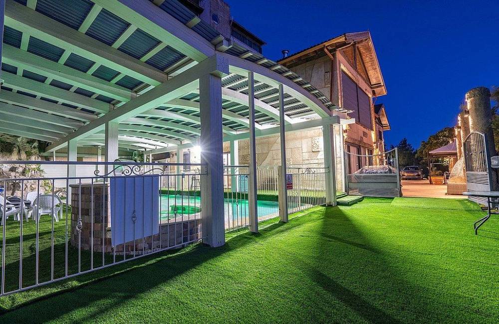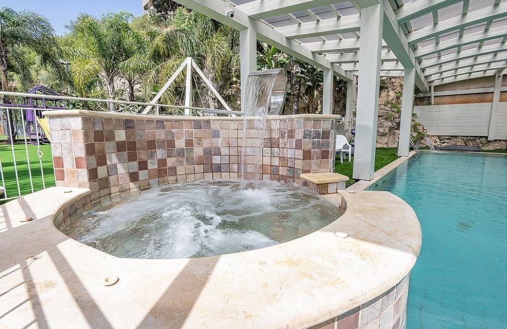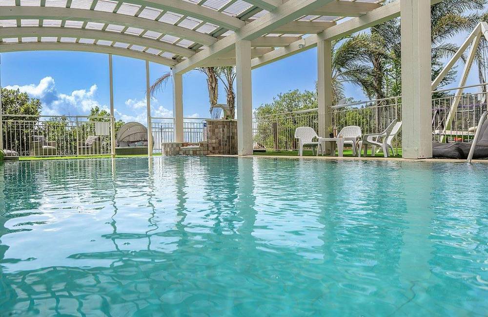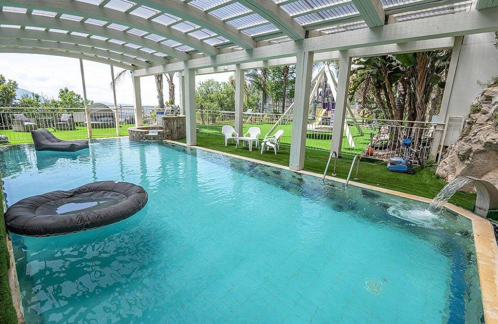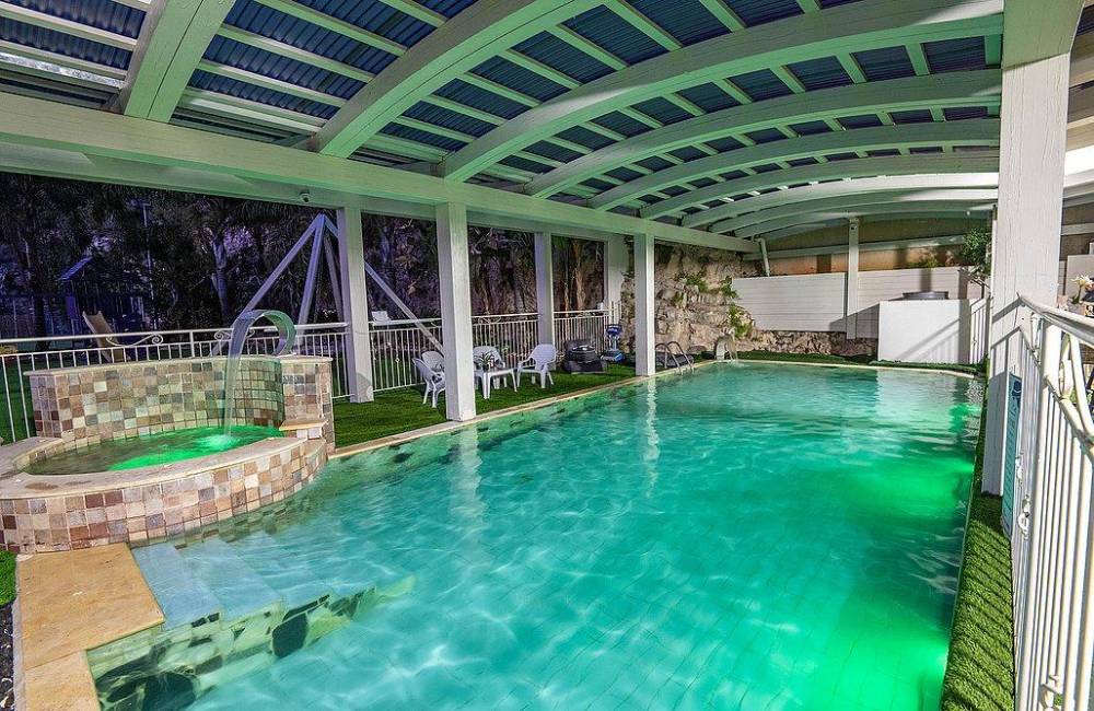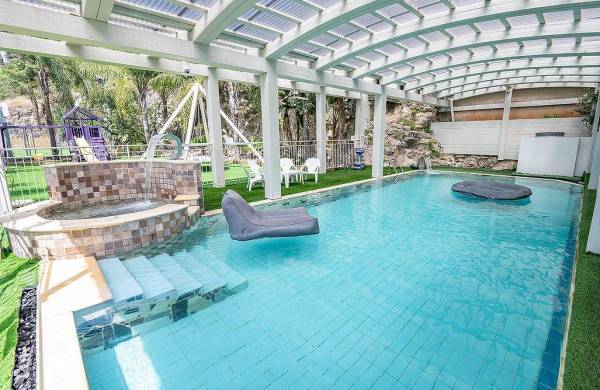 בריכת שחייה מחוממת מקורה ומגודרת עם מפל מים