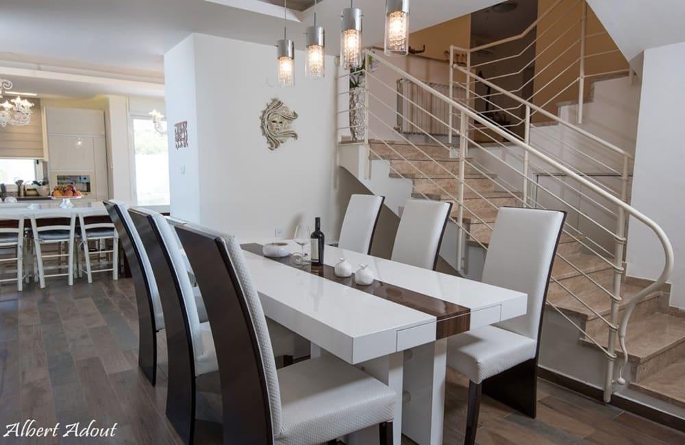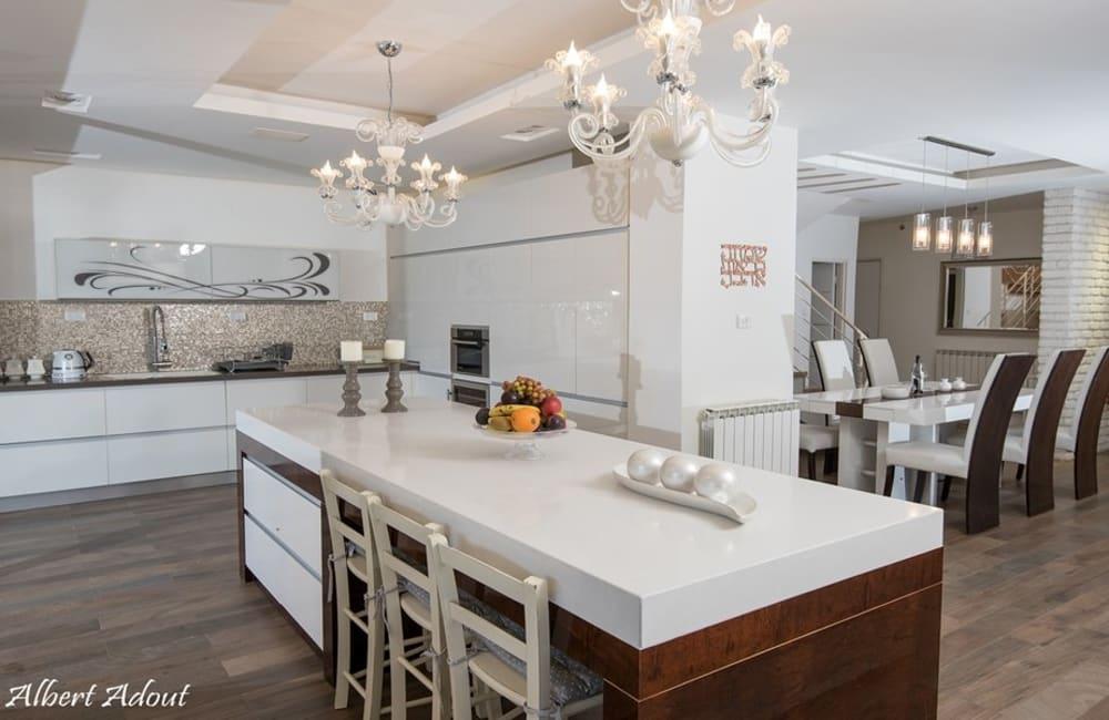 מטבח כשר ומקצועי הכולל, אי גדול עם כיסאות בר במרכז, מפריד בין המטבח הבשרי למטבח החלבי