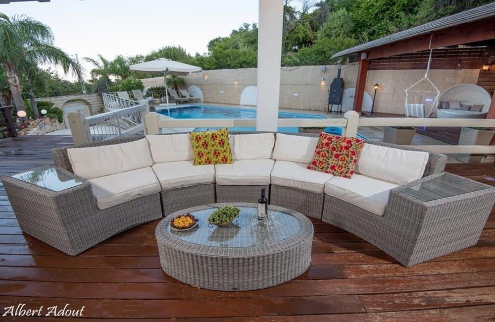 חצר יפיפייה עם מגוון פינות ישיבה מוצלות תחת פרגולות ופינות זולה לרביצה מושלמת