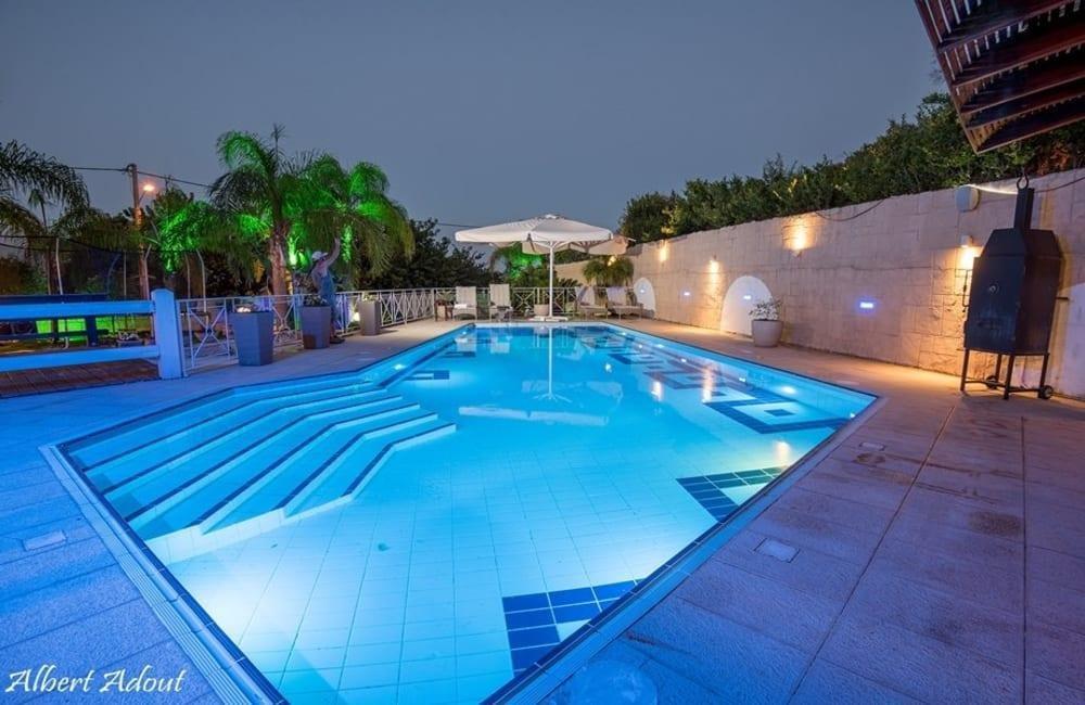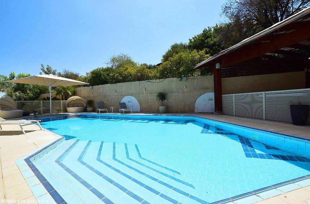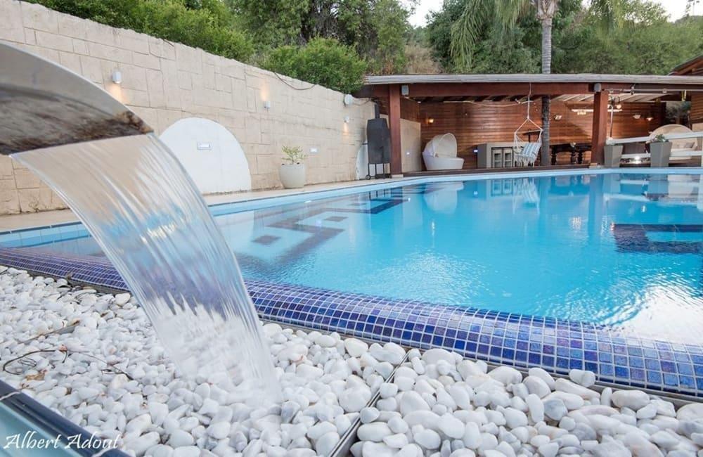 בריכת שחיה פרטית מחוממת ובנויה בגודל 5/12 מ' עם מפל מים ומיטות שיזוף מפנקות