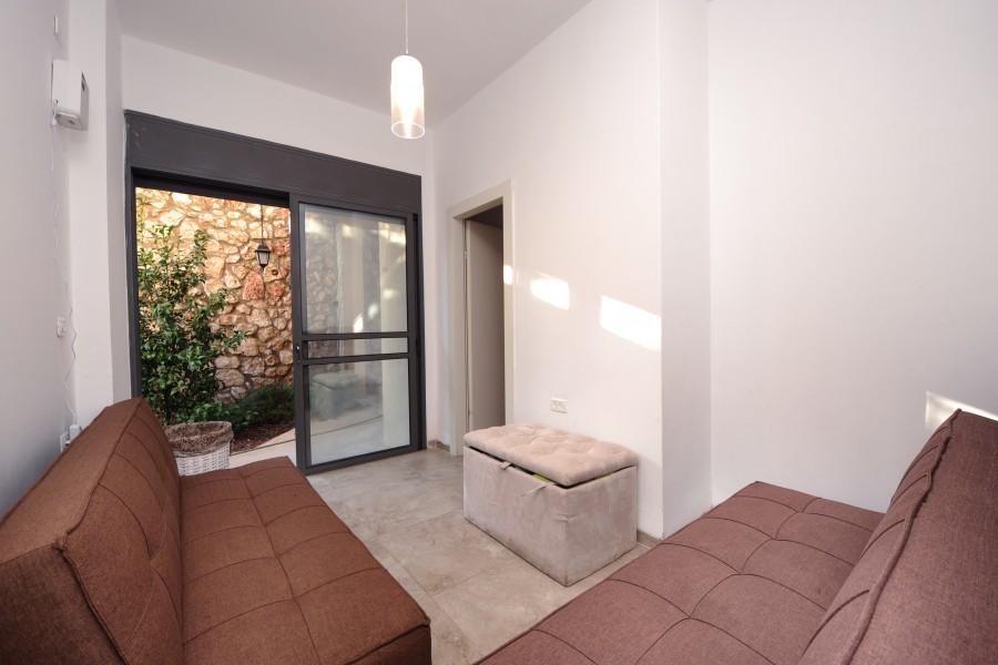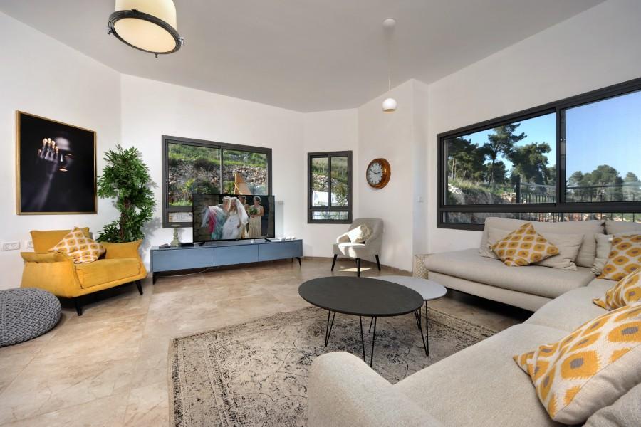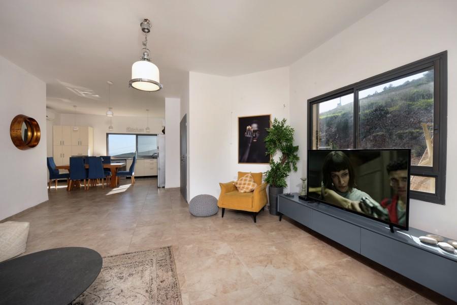 סלון מעוצב עם ספות וטלוויזיה 60 אינץ' וערוצי YES ומערכת שמע מקצועית