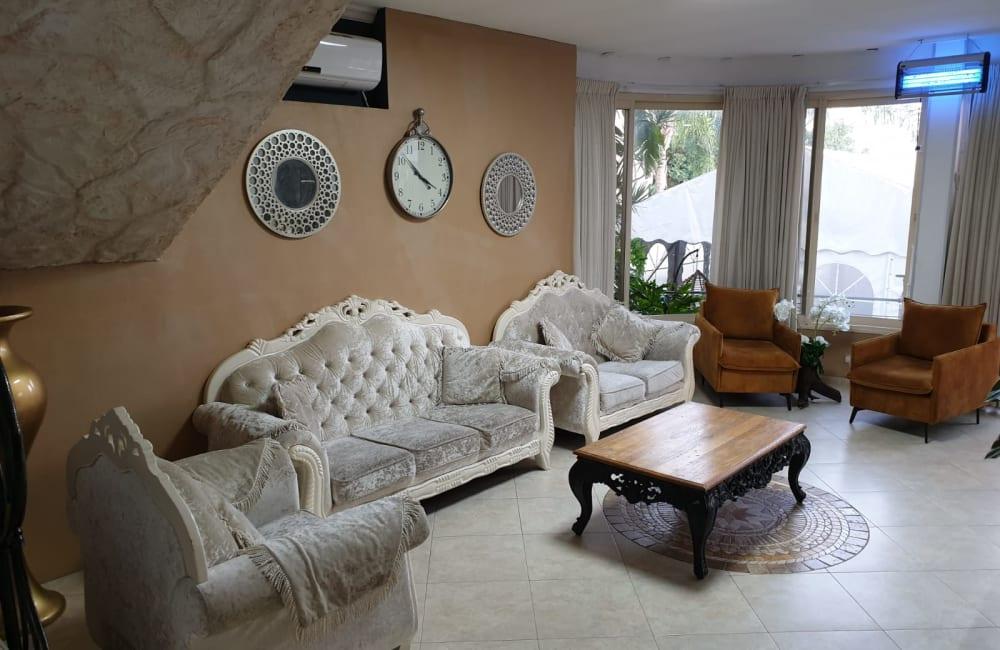 סלון רחב ידיים עם מערכת ישיבה ל24 אנשים, מסך שטוח בגודל 65 אינץ' עם חיבור לYES