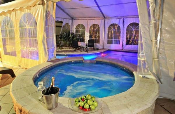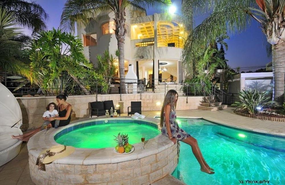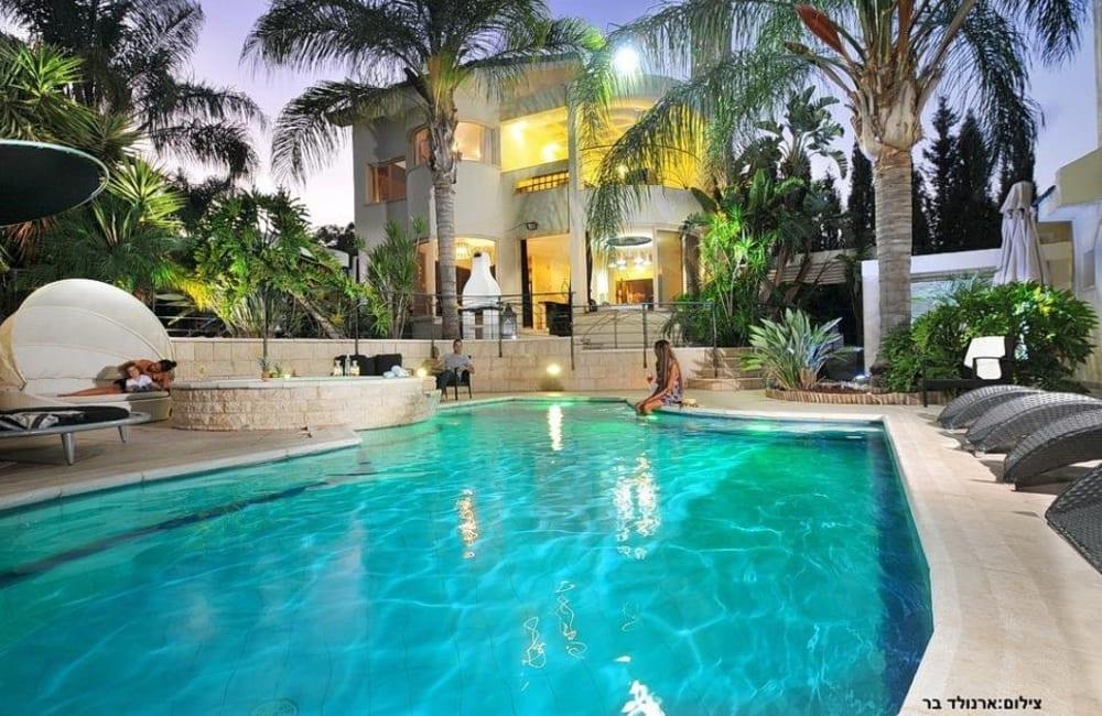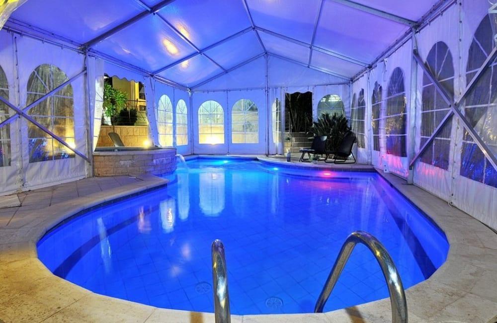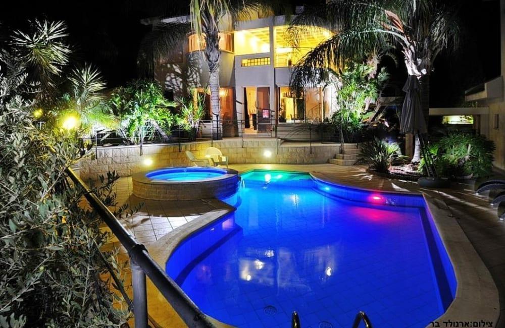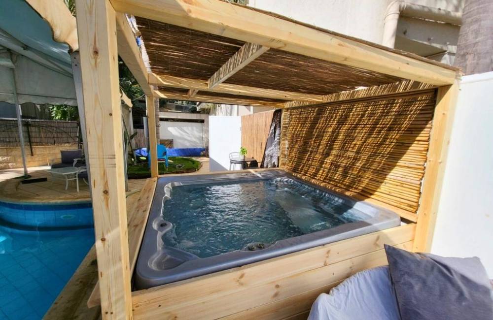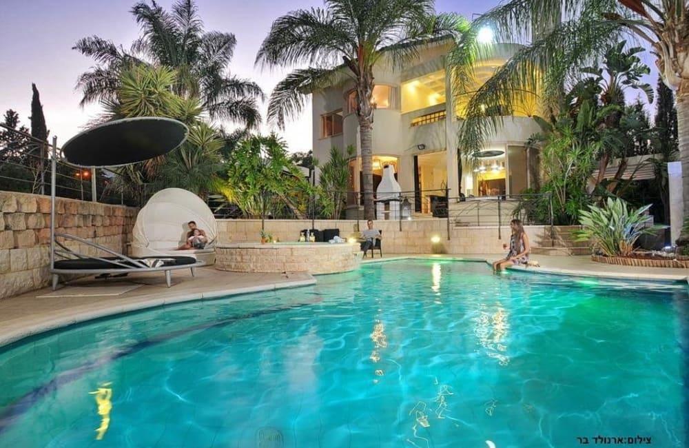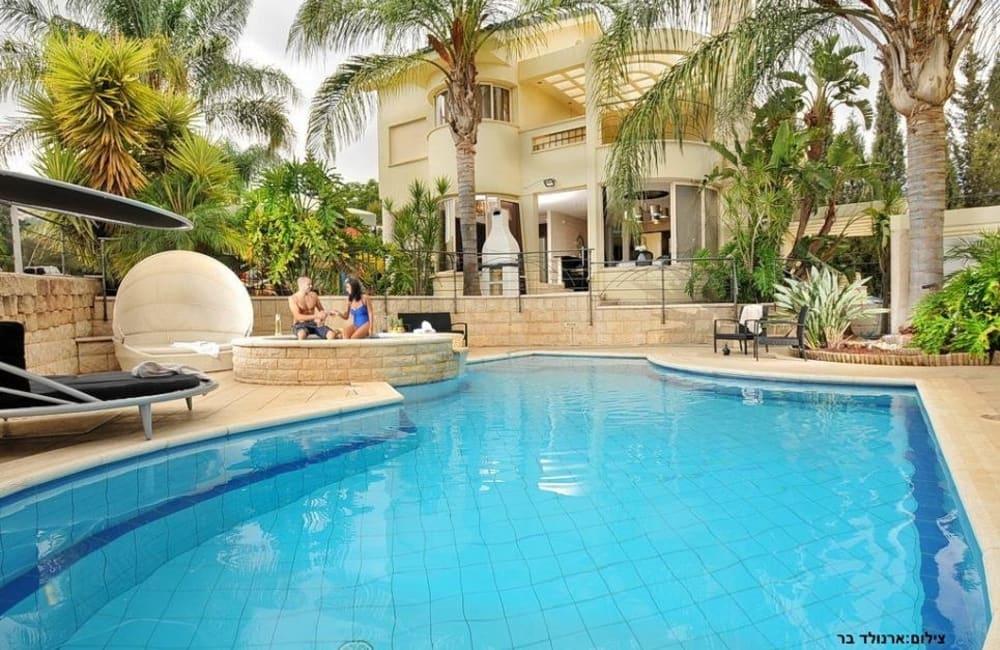 המתחם החיצוני משגע ובו בריכת שחייה ענקית מחוממת מקורה בגודל 7 X10