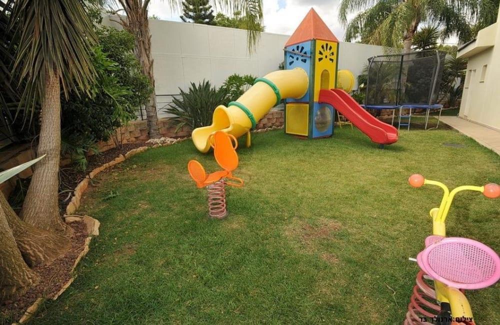 גן שעשועים לילדים עם טרמפולינה, מגלשה ונדנדות.