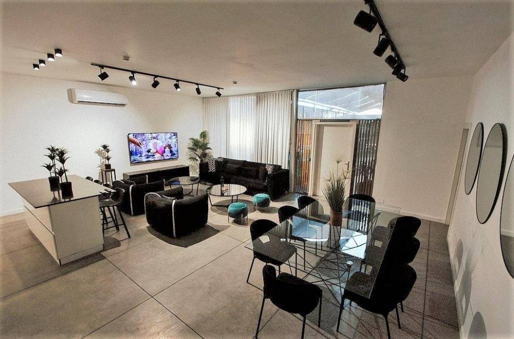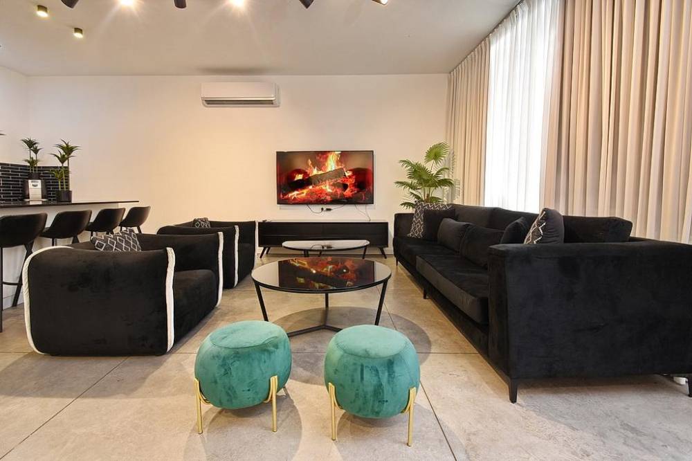 סלון מפואר עם מערכת ישיבה וטלוויזיה