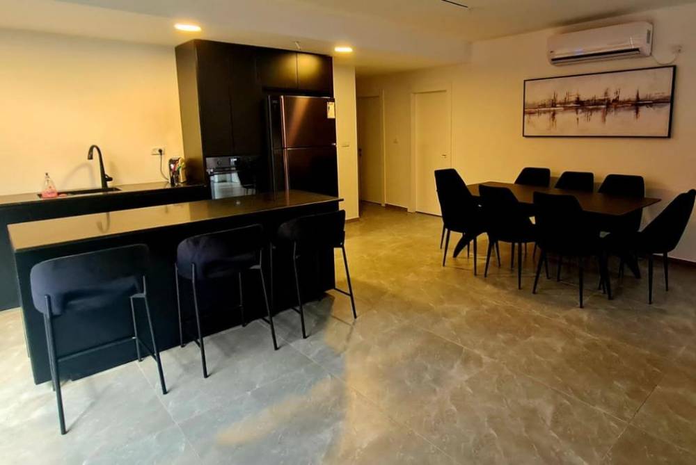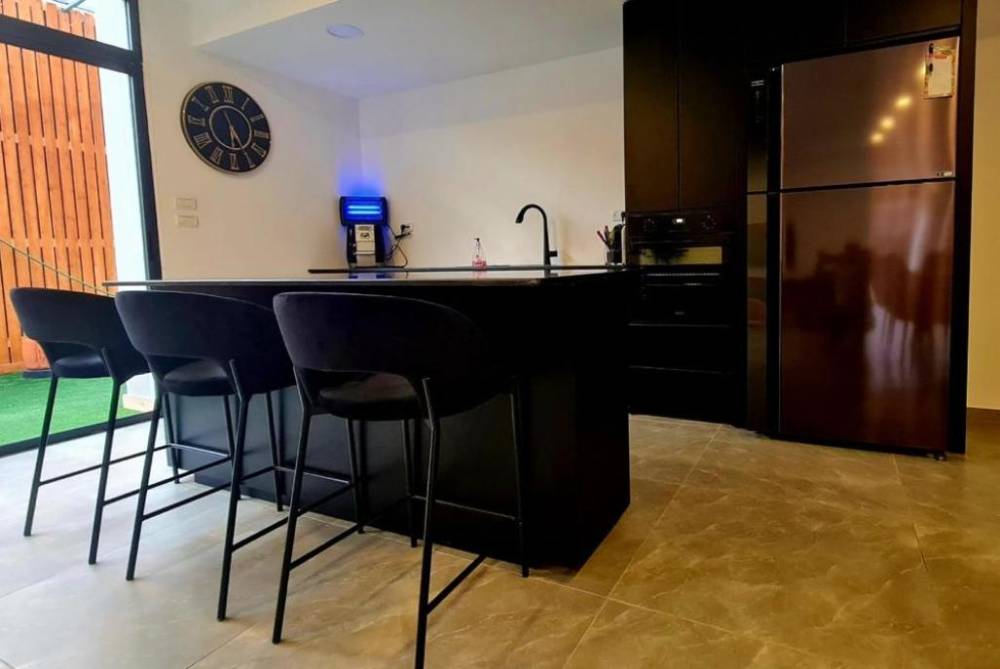 מטבח מאובזר קומפלט הכולל בין היתר מקרר, תנור אפייה, מיקרוגל, תמי4, כיריים חשמליות, פלטה ומיחם.