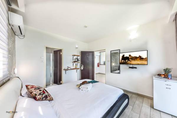 בסוויטה תיהנו ממיטה זוגית נעימה ונוחה, חדר רחצה המאובזר במוצרי טקסטיל, מגבות וגם מרפסת פרטית עם במת דק שיזוף ובנוסף ג'קוזי.