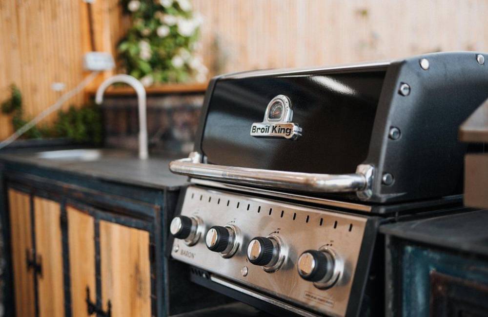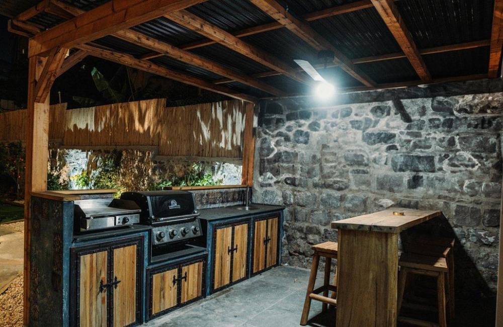 מטבח חוץ עם פינת ברביקיו על גז ופחמים, משטח עבודה, מקרר