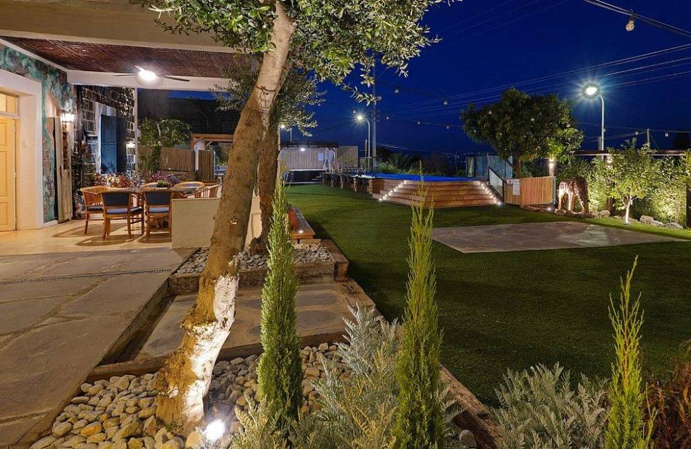 מתחם חצר גדול עם מדשאות וריהוט גן