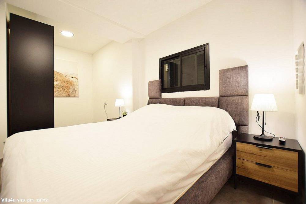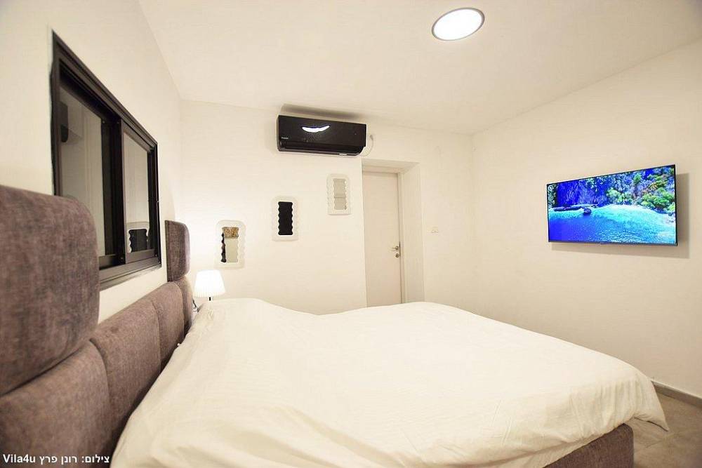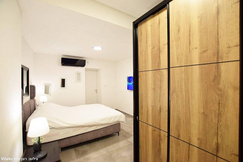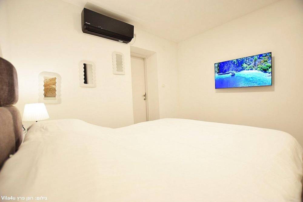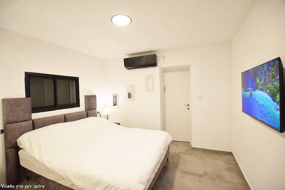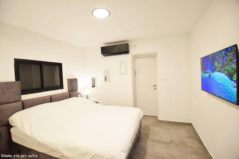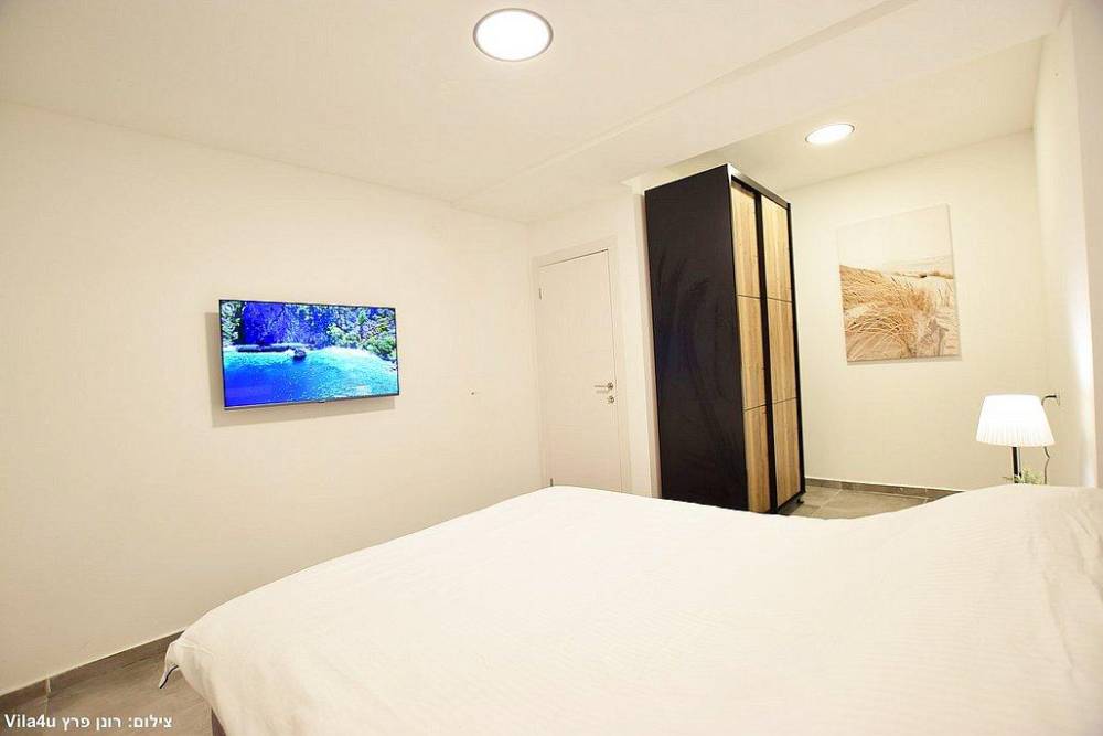 - כל חדר כולל: מיטה זוגית, ארונות לאחסון, שידות לאחסון, טלוויזיה חכמה, מיזוג אוויר