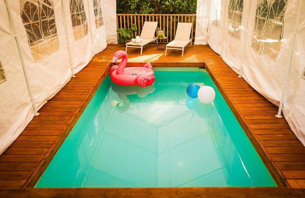 בריכת אינטקס גדולה ושקועה באדמה, הבריכה מקורה ומחוממת בחורף