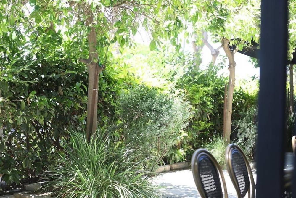 מגוון עצי נוי ופרי עוטפים את מתחם הגן