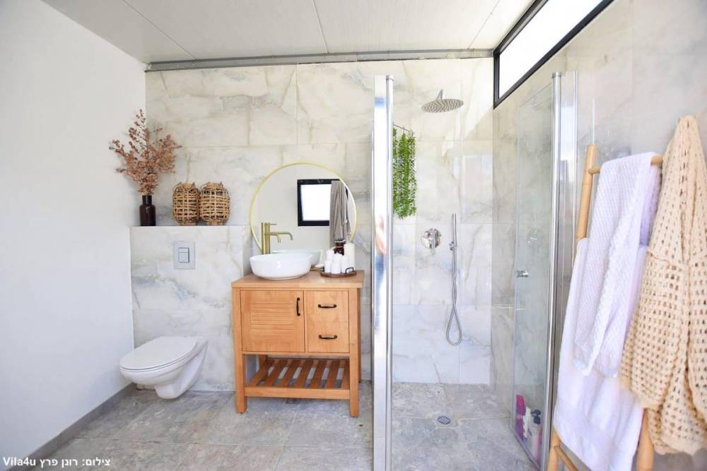 - חדר רחצה מאובזר עם מקלחון ושירותים