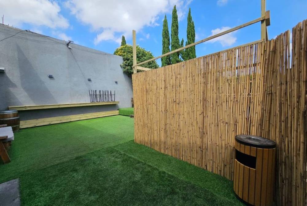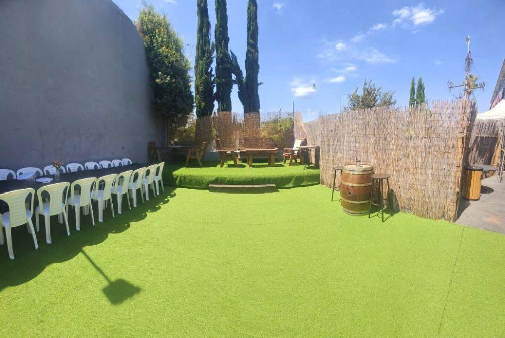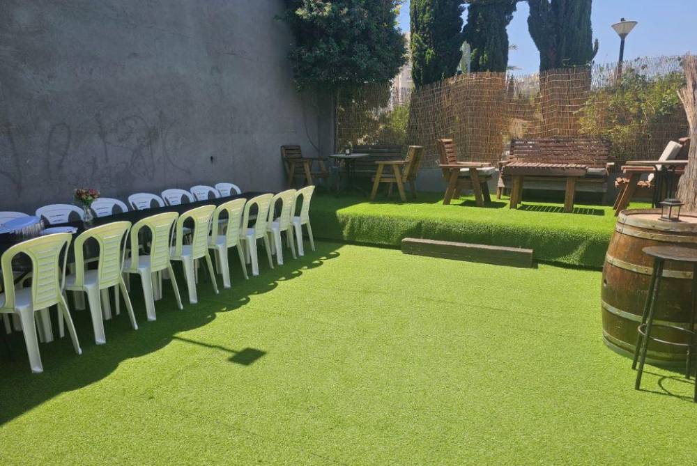 מתחם חיצוני צמוד למקום עם מדשאה ואזורי ישיבה ורביצה
